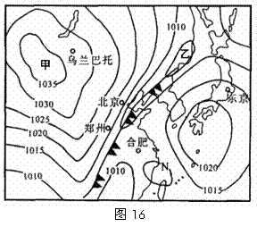 (15分)图16为亚洲局部区域某时刻海平面等压线分布图(单位:hPa),读图回答下列问题。