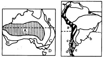 (2)澳大利亚东岸B、C、D三地气候与南美洲西岸a、c、d三地气候的排列都是南北更替、南北延伸,形成这种状况的相同因素主要有 (2分),不同因素主要有 。(2分)