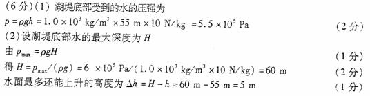 (2)假设该湖堤底部和湖堤各部分能承受的水的最大压强都是6 ×105 Pa,那么,最多还能允许水面上升多少米?