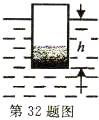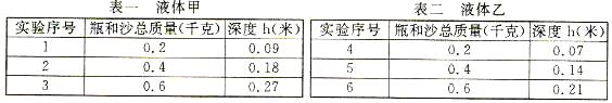 (09金华)32.某研究性学习小组的同学为了制作能够方便鉴别液体种类的仪器。他们猜测漂浮在液面上的物体浸在液体中的深度可能与物体的质量、液体的种类存在着某种关系,并进行实验探究。实验时,该小组同学选用一个圆柱形的瓶子,内装不同质量的细沙,先后漂浮在甲、乙两种液体中,并用仪器测出每一次实验时瓶和细沙的总质量及圆柱形的瓶子底部所处的深度h(已知甲、乙两种液体的密度分别为ρ甲、ρ乙),如图所示。记录的数据如表一、表二所示。