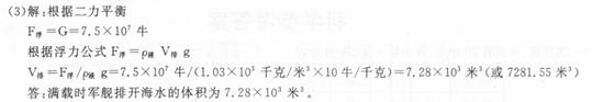(3)参加护航的“武汉号”是我军编队中一艘现代化的军舰,军舰满载时重7.5×107牛,则满载时军舰排开海水的体积为多少米3?(海水的密度ρ=1.03X103千克/米3,g取10牛/千克)(计算结果保留两位小数)