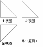 15.如右图,一个空间几何体的主视图、左视图、俯视图为全等的等腰直角三角形,如果直