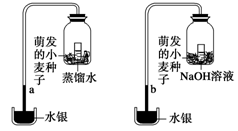 如图所示,将等质量的正在萌发的小麦种子,分别放在内有一杯等体积的NaOH溶液或蒸馏水并用塞子塞紧的两个瓶中,各瓶分别与一个水银流体压力计相连接,由此压力计水银柱升高的高度可以测量出某种气体的变化量。开始时两个水银流体压力计的水银柱a、b高度一致。将装置放在适宜的条件下使种子萌发,过一段时间后,会发现a、b高度是