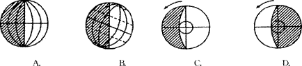 [例1](2006高考综合卷)太阳直射点在地球上的南北移动造成了各地昼夜长短的变化。下图中的斜线部分表示黑夜,其中能反映上海地区白天最短的是 ( )