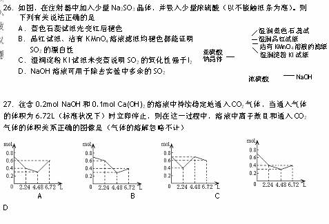 29.(12分)有一可能含Cu2+、Al3+、Mg2+、Na2+、Cl-、CO32-、SO42-的溶液。加入BaCl2产生白色沉淀;加入稀HCl溶液,没有气体产生;若加入Na2O2则有无色无味气体产生,并生成白色沉淀,加入Na2O2的量与生成白色沉淀量关系如图所示,则: