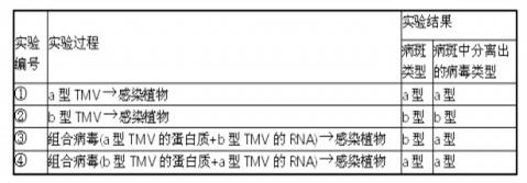 17.科学家从烟草花叶病毒(TMV)中分离出a、b两个不同品系,它们感染植物产生的病斑形态不同。下列4组实验(见下表)中,不可能出现的结果是 ( )