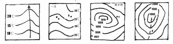 C.丙图c处风向为偏北风 D.丁图d处为山脊