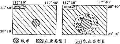 读我国某地区城市及周围区域农业地域类型变化图,回答21-23题。