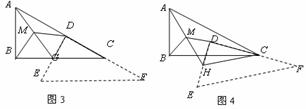 (1)若ED与BC相交于点G,取AG的中点M,连接MB、MD,当△EFD纸片沿CA方向平移时(如图3),请你观察、测量MB、MD的长度,猜想并写出MB与MD的数量关系,然后证明你的猜想;![]()