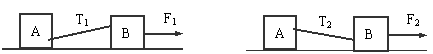 10、如图所示A、B两木块放在水平面上,它们用细线相连,两次连接情况中细线倾斜方向不同但倾角一样. 两木块与水平面间的摩擦系数相同,先后用水平力F1和F2拉着A、B一起匀速运动,则