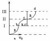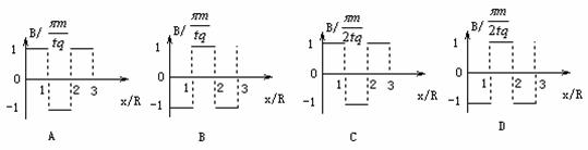 图中重力不计,质量为m,带正电且电荷量为q的粒子,从a点以某一初速度v水平射入一个磁场区域沿曲线abcd运动,ab,bc,cd都是半径为R的圆弧,粒子在每段圆弧上的运动时间都是t,如果把由纸面穿出的磁场方向定为正值,则磁场区域Ⅰ、Ⅱ、Ⅲ三部分的磁感应强度B随x变化关系图像应为图所示的哪一个? [ ]