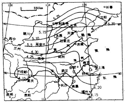 某一地区同时出现某一物候现象的各点的连线简称为等物候线。读我国东部刺槐年平均始花期图(图中数字代表开始日期),回答17-18题: