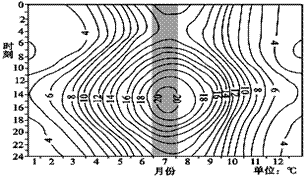 下图为某地全年平均气温(30年平均)的等温线图,读图完成19-20题。