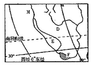 35.E地为纳米布沙漠,它沿非洲西南大西洋海岸延伸2100千米,该沙漠最宽处达160千米,而最狭处只有10千米,其沿海岸线延伸的原因是