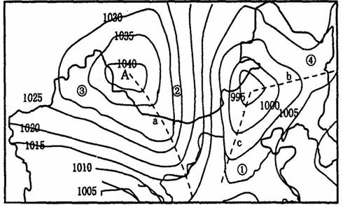 ⑵ 图中虚线(a、b、c)附近易形成暖锋的是 , c系统过境后的天气是: