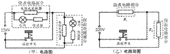 问:(1)照明灯正常工作时通过灯丝的电流是多少? (2)通常在洗浴前10min只闭合开关S1 、S2开启红外线取暖灯给浴室预热,问在这10min内“浴霸”消耗的电能是多少? 2.(泰州)下图是电饭锅的实物图,图(甲)是它的内部电路图,图(乙)是电路简图它有“高温烧煮”和“焖饭、保温”两挡,由温控开关自动控制.煮饭时,先要按下温控开关按钮;到达设定温度(饭已煮熟),按钮会自动弹起 (1)对照观察图(甲)和(乙),温控开关按钮未按下时,“烧煮电路部分”与“保温电路部分”是 关系(选填“串联”或“并联”);按下温控开关按钮. “烧煮电路部分”的电压为 V, “保温电路部分”将 (选填“工作”或“不工作”);温控开关按钮弹起后,电路中的电流比原来 (选填“大”或“小”) (2)当温控开关按钮按下时,电饭锅电路的总功率为1100W。求: “烧煮电路部分”的电阻R1 ; (3)温控开关按钮弹起后,电饭锅电路的总功率为44W。求:①电路中的电流;②“保温电路部分”的电阻R3; (4)已知,只有当指示灯和限流器两端的电压与电源电压相差不大时,指示灯才会发光.请通过相关计算或分析,说明为什么温控开关按钮弹起时,红灯熄灭而黄灯亮。