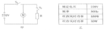3.(攀枝花)电吹风是现代家庭的常用电器。如图甲所示是电吹风的电路原理图,R是电热丝,M是带动风扇转动的电动机,某电吹风的主要技术参数如图乙所示:
