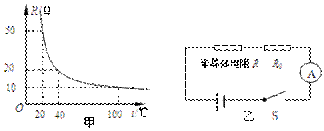 (1)当只闭合S1时,电吹风正常工作1min消耗的电能是多少J, (2)当同时闭合S1、S2时,电吹风正常工作,通过R的电流为多大, (3)当电吹风正常工作并且吹热风时,1min内电流通过R产生的热量是多少J, 4.(宿迁) 半导体材判的导电能力介于导体和绝缘体之间.其电阻受温度影响较大.下图甲是某种半导体材料的电阻随温度变化的关系图像.根据这种半导体材料电阻的特性,小星和他的同学设计了一个电路(如图乙).可以测定某一空间的温度使用的器材如下:半导体电阻、电源、电流表(0-0.6A).开关,定值电阻R0(10Ω)、导线若干. (1)定值电阻R0的作用是什么? 。 (2)当环境温度为20℃时.电流表的读数为0.2A,求电源的电压。 (3)电流表的读数为0.4A时,当时环境温度是多少?半导体电阻的电功率是多少?