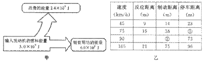 5.(无锡)汽车已经成为现代生活中不可缺少的一部分,环保、节能、安全是汽车研发和使用时必须关注的问题。 (1)普通汽车行驶时,发动机将燃料燃烧产生的内能变为机械能。图甲是某型号的普通汽车发动机的能量流向图,请依据图中提供的信息,计算该汽车发动机的效率。为提高该类汽车发动机的效率,请提出一种合理的设想。 (2)普通汽车排出的高温尾气会污染空气,为弘扬“绿色奥运”,2008奥运期间,北京将使用以蓄电池为驱动能源的环保汽车。某环保汽车在匀速行驶时,驱动电机的输入电流为50A,电压为300V,则该驱动电机的输入功率为多少? (3)汽车在行驶途中保持车距是一项重要的安全措施。因为,从驾驶员看见某一情况到采取制动动作的时间里,汽车仍然要通过一段距离(称为反应距离),从采取制动动作到车完全停止的时间里,汽车又要通过一段距离(称为制动距离)。表乙给出了某型号的汽车在不同速度下的部分数据,分析表乙中的数据,请回答:空格①②的数值各是多少,影响汽车制动距离的因素是什么?