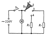 (2008大连)某电吹风的简化电路图如图所示,R1、R2是发热电阻丝,M是电动机。开关S1闭合后,S2接l、2时吹冷风,通过电动机的电流为0.1A;S2接2、3时吹温风,R1的阻值为110Ω。S2接3、4时吹热风,电吹风的总功率为1100W。电源电压为220V。试求: