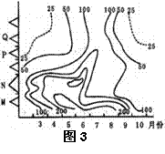图3所示是我国东经110°以东地区的月等降水量线分布状况,M、N、P、Q分别代表不同纬度带的四个地区,根据图中提供的信息,完成8-9题:
