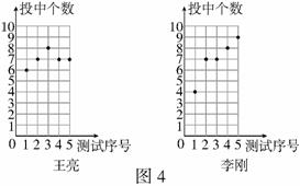 6.某市篮球队到市一中选拔一名队员.教练对王亮和李刚两名同学进行5次3分投篮测试,每人每次投10个球,图4记录的是这两名同学5次投篮中所投中的个数.