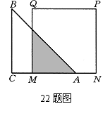 22.(本题满分10分) 如图,等腰直角△ABC的直角边长与正方形MNPQ的边长均为10 cm,AC与MN在同一直线上,开始时A点与M点重合,让△ABC向右运动,最后B点与P点重合.![]()