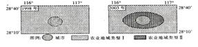 读我国某地区城市及周围区域农业地域类型变化图,回答1-3题。