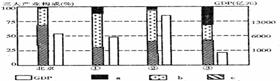 4—6、答案:A D D[解析];根据北京的产业构成图可判断a、b、c分别是第一、二、三产业;四川省不位于东部沿海;浙江省的GDP最高,农业的单产较高;海南省第一产业的比重最大,热量条件充足,一年三熟,农产品的品种丰富,黑龙江人均耕地面积大,农产品的商品率高。