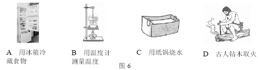 9在如图6所示的四个过程中,食物、温度计、水和圆木的内能都会发生改变,其中利用做功的方式来改变物体内能的是( )