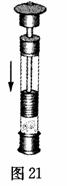 20如图21所示,在一个配有活塞的厚壁玻璃筒中放一小团硝化棉,迅速向下压活塞,压缩玻璃筒内的空气,对筒内空气做了_______________,空气__________增加,温度升高,棉花燃烧起来。