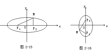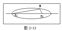 以两定点F1、F2的直线为x轴,线段F1F2的垂直平分线为y轴,建立直角坐标系(如图2-14).设|F1F2|=2c(c>0),M(x,y)为椭圆上任意一点,则有F1(-1,0),F2(c,0).