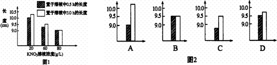 2、用打孔器取同一萝卜10cm长的直根条,分成4组,其中3组分别置于20g·L-1、60g·L-1、80g·L-1的KNO3溶液中,测量结果如图1。若将第4组放在40g·L-1的KNO3溶液中,其测量结果可能是图2中的( D )![]()