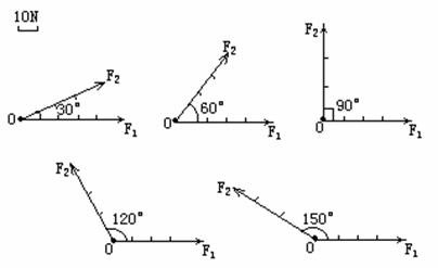[例二]用作图法求夹角分别为30°、60°、90°、120°、150°的两个力的合力.再求它们的夹角是0°和180°时的合力.比较求得的结果,能不能得出下面的结论:①合力总是大于分力;②夹角在0°到180°之间时,夹角越大,合力越小.