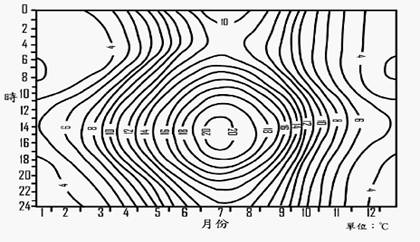 下图为某地全年逐日逐时平均气温( 30年平均)的等温线图。这种气候图与其他气候图相较,更能反映与农林生产相关的气温分布实况。读图回答3-5题。![]()