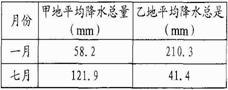 下图是某岛屿沿东西方向地形剖面示意图。表格是岛屿甲、乙两地1月和7月平均降水状况,完成11-12题。 ![]()