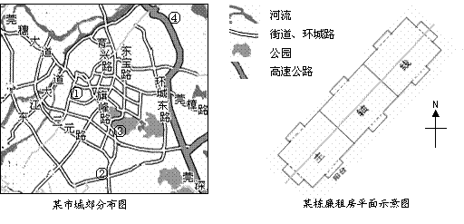 廉租房是指政府向符合城镇居民最低生活保障标准且住房困难的家庭提供社会保障性质的住房。廉租房并非高档住宅,一般为一梯四户。读下图完成都市19-20题。