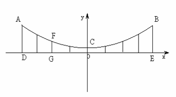5、(08桂林)桂林红桥位于桃花江上,是桂林两江四湖的一道亮丽的风景线,该桥的部分横截面如图所示,上方可看作是一个经过A、C、B三点的抛物线,以桥面的水平线为X轴,经过抛物线的顶点C与X轴垂直的直线为Y轴,建立直角坐标系,已知此桥垂直于桥面的相邻两柱之间距离为2米(图中用线段AD、CO、BE等表示桥柱)CO=1米,FG=2米