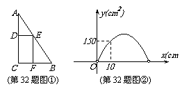 32、(长春07)如图①,在Rt△ABC中,∠C=90°,边BC的长为20cm,边AC的长为hcm,在此三角形内有一个矩形CFED,点D、E、F分别在AC、AB、BC上,设AD的长为xcm,矩形CFED的面积为y(单位:cm2).