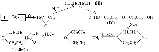 式 。 ② 化合物Ⅱ与氧气反应的原子利用率达100%,其化学式为 。 ③ 关于化合物Ⅲ、Ⅳ的说法正确的是 (填代号) A 都可发生酯化反应 B Ⅲ可被氧化,Ⅳ不可被氧化 C 都溶于水 D Ⅲ可与钠反应,Ⅳ不可与纳反应 E Ⅲ是乙醇的同系物 F Ⅲ可由卤代烃的取代反应制备 ④ 写出合成NMMO最后一步反应的化学方程式 。