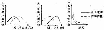 有一种能生产食品香料的细菌,其生长速率、代谢产物的产量与培养液中的温度、pH、溶氧量等关系如右图所示。则在发酵罐中生产该食品香料时,应控制的培养条件不包括( )