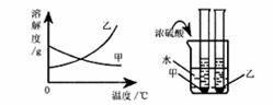 13. 甲乙两种固体物质的溶解度曲线如图所示。现将两支分别装有甲乙两种物质饱和溶液(底部均有未溶解的固体)的试管浸入盛有水的烧杯里,然后向烧杯中加入一定量的浓硫酸,则对相关变化判断正确的是
