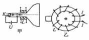 [日照市]10.如图所示,图甲为电视机显像管的结构示意图,其左端尾部是电子枪,阴极发射的“热电子”经过电压U加速后形成电子束,向右高速射出。在显像管的颈部装有两组相互垂直的偏转线圈L,图乙是其中一组“纵向”偏转线圈从右侧向左侧看去的示意图,当偏转线圈中有图示方向的电流时,在显像管颈部形成水平向左(即甲图中垂直纸面向外)的磁场,使自里向外(即甲图中自左向右)射出的电子向上偏转;若该线圈中的电流反向,电子则向下偏转。改变线圈中电流的大小,可改变偏转线圈磁场的强弱,电子的纵向偏转量也随之改变。这样,控制加在 “纵向”偏转线圈上的交变电压,就可控制电子束进行“纵向”(竖直方向)扫描。同理,与它垂直的另一组“横向”偏转线圈,通入适当的交变电流时,则能控制电子束进行“横向”(水平方向)扫描。这样,两组偏转线圈可控制电子束反复在荧光屏上自上而下、自左而右的扫描,从而恰好将整个荧光屏“打亮”。若发现荧光屏出现一条水平亮带(即竖直幅度变小,水平幅度正常),则可能是下列哪些因素引起的 ( D