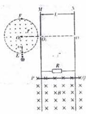 [青岛十九中]17.(12分)如图所示,半径为r、圆心为Ol的虚线所围的圆形区域内存在垂直纸面向外的匀强磁场,在磁场右侧有一坚直放置的平行金属板M和N,两板问距离为L,在MN板中央各有一个小孔O2、O3、O1、O2、O3在同一水平直线上,与平行金属板相接的是两条竖直放置间距为L的足够长的光滑金属导轨,导体棒PQ与导轨接触良好,与阻值为R的电阻形成闭合回路(导轨与导体棒的电阻不计),该回路处在磁感应强度大小为B,方向垂直纸面向里的匀强磁场中,整个装黄处在真空室中,有一束电荷量为+q、质量为m的粒子流(重力不计),以速率v0圆形磁场边界上的最低点E沿半径方向射入圆形磁场区域,最后从小孔O3射出。现释放导体棒PQ,其下滑h后开始匀速运动,此后粒子恰好不能从O3,而从圆形磁场的最高点F射出。求: