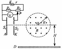 mm,连在如图所示的电路中,电源电动势E=91V,内阻r=1Ω定值电阻R1=10Ω,滑动变阻器R2的最大阻值为80Ω,S1、S2为A、K板上的两上小孔,且S1、S2跟O点在垂直极板的同一直线上,OS2=2R,另有一水平放置的足够长的荧光屏D,O点跟荧光屏D之间的距离为H=2R。比荷为2×105C/kg的正离子流由S1进入电场后,通过S2向磁场中心射去,通过磁场后落到荧光屏D上。离子进入电场的初速度、重力、离子之间的作用力均可忽略不计。问: