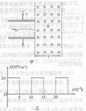 的带负电粒子(其重力不计)以vo=8X105m/s速度从两板中间沿与板平行的方向射人偏转电场,进入偏转电场时,偏转电场的场强恰好按图乙所示的规律变化,粒子离开偏转电场后进入匀强磁场,最终垂直磁场右边界射出.求: