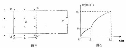 属杆ab。若ab杆在恒力作用下由静止开始向右运动,其速度v-位移x的关系图象如图乙所示,则