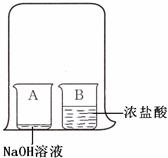 (4分)如右图所示,在A烧杯中加入少量氢氧化钠溶液,并滴入几滴酚酞溶液;在B烧杯中加入足量的浓盐酸,然后用一个大烧杯罩住A、B两个小烧杯。