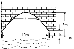 23、右图是佛山某河上一座古拱桥的截面图,拱桥桥洞上沿是抛物线形状,抛物线两端点与水面的距离都是1m,拱桥的跨度为10m,桥洞与水面的最大距离是5m,桥洞两侧壁上各有一盏距离水面4m的景观灯.若把拱桥的截面图放在平面直角坐标系中(如下图).