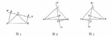 (3)当直线MN绕点C旋转到图3的位置时,试问DE、AD、BE 具有怎样的等量关系?请写出这个等量关系,并加以证明.